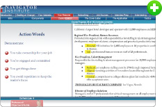 Our advisors' corporate experience of having accepted and rejected tens of thousands of resumes served as the basis for the development of the Navigator Institute's custom Resume Builder feature. Applying our proven formats, the latest interactive technology, and the online learning system's built-in database, we have made writing professional resumes easier and faster than ever before.