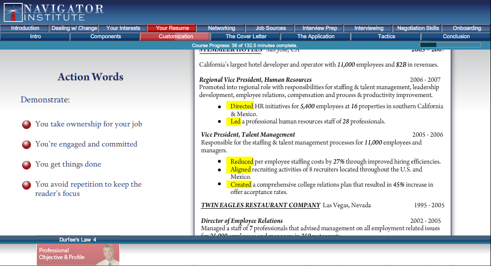 Everything you need to know about writing your resume is laid out before you. Our host will walk you through the different sections, formats, and the critical matters of style and content. The tutorial covers when and how to insert key words, action words, competencies, and countless other techniques that enhance and polish ordinary resumes.